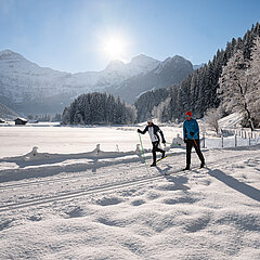 The trail on the Hasler Hochmoor offers much more than just cross-country skiing. Exciting scenery up to the bizarre Gryden and into the distance to Albrist and Spillgerten.